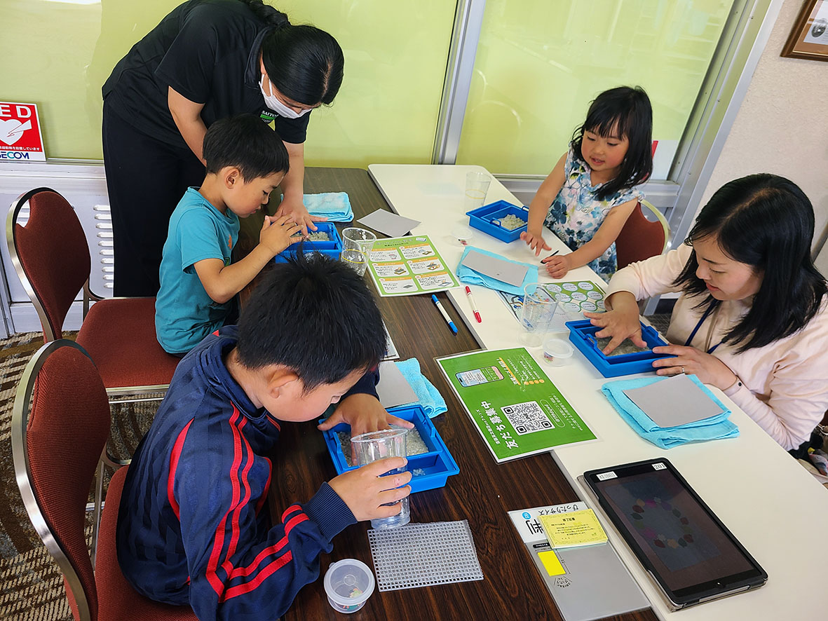 この他、恒例のネイチャービンゴ、謎解きゲーム、麗澤大学馬術部による馬とのふれあい、落ち葉アート、桜の枝のクラフトアート、葉書をつくろう!紙すきワークショップ(協力:斎藤英次商店)、折り紙教室(協力:柏シルバー大学院)などの体験コーナーも実施し、新緑の園内を楽しんでいただきました。さらに、当財団の小冊子『ニューモラル』のイメージキャラクターで、なんじゃもんじゃの木の妖精「もらんちゃん」が登場し、子供たちも大興奮。