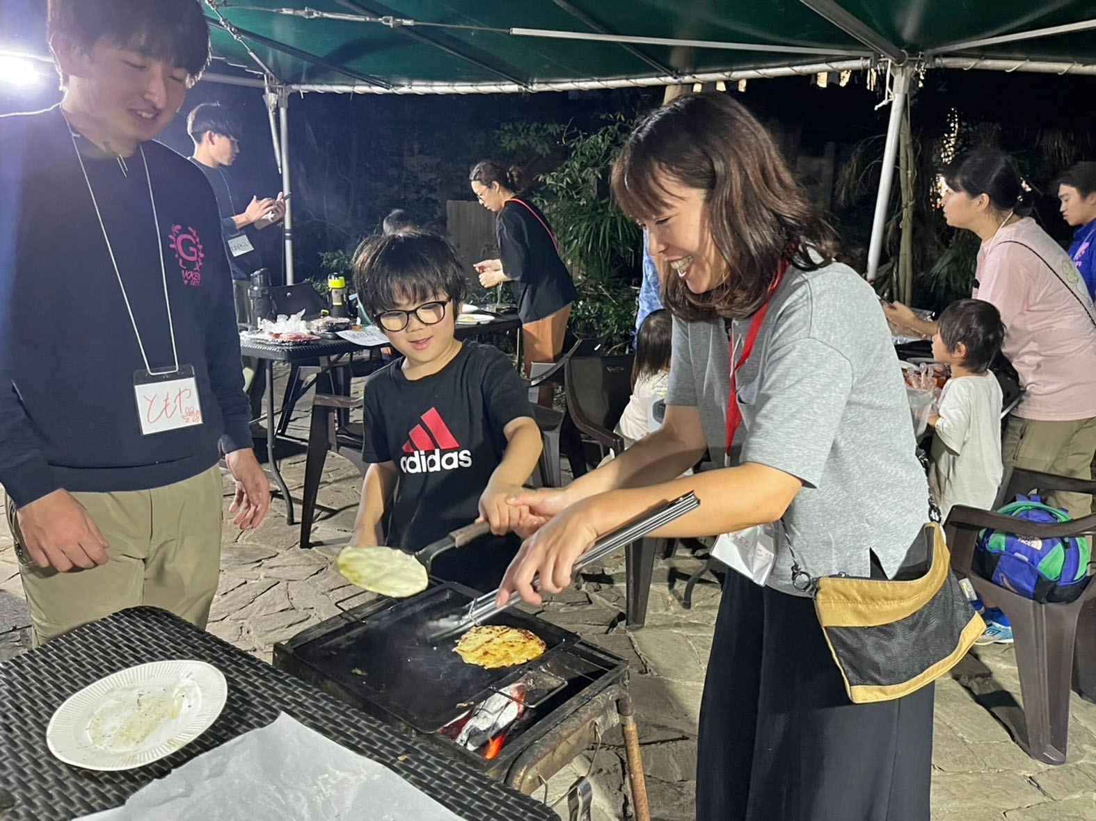 初日は小雨が降る時間もありましたが、テント設営や火おこし体験、家族対抗のかるた大会など、多様なプログラムを行いました。夕食では、肉巻きおにぎりやBBQをお楽しみいただき、その後のナイトウォーク(謎解きゲーム)も元気に活動して1日目が無事終了しました。