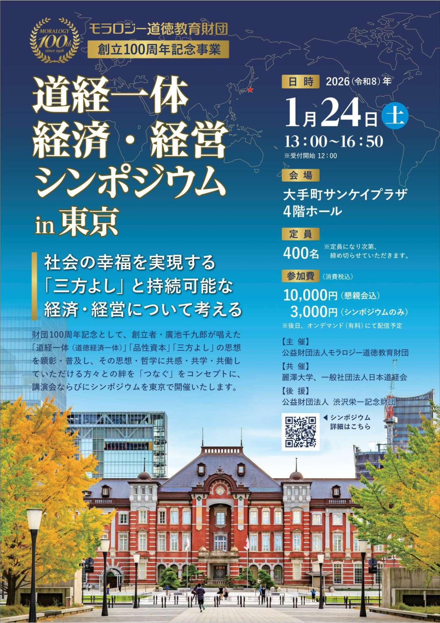 令和8年に迎える当財団創立100周年を記念し、令和8年1月24日(土)に「道経一体 経済・経営シンポジウム in 東京」を開催いたします。