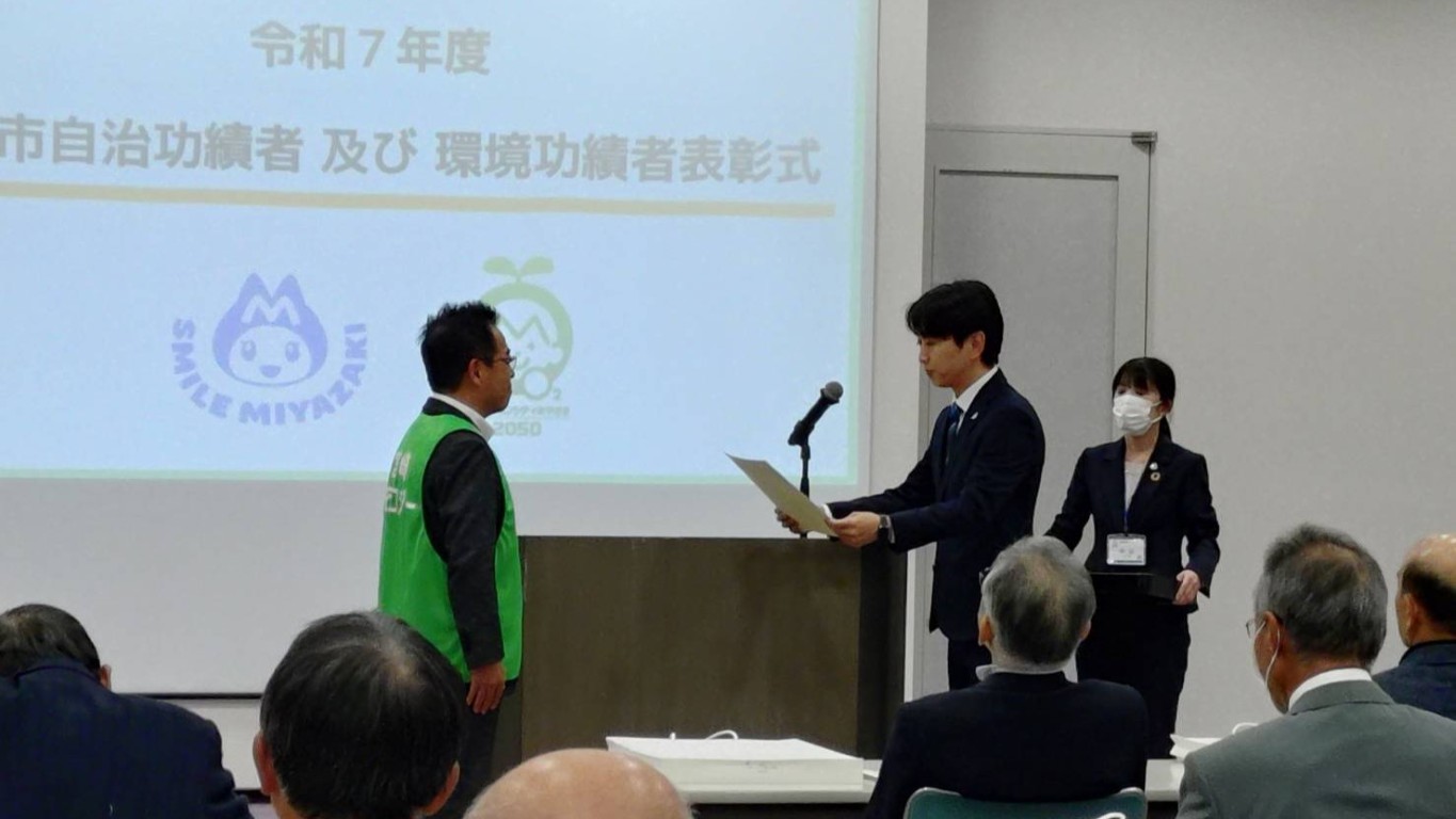 これは、宮崎市の環境分野での市政発展に尽力した自治功労者ならびに環境に係る活動で特に顕著な功績があった環境功績者を表彰するものです。